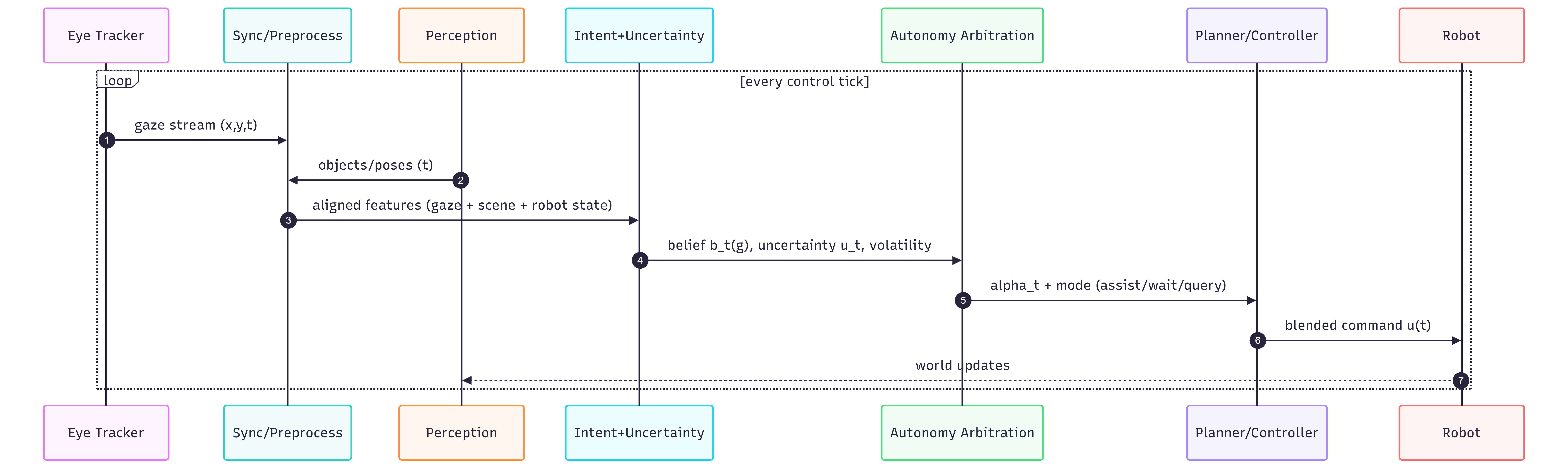 A practical architecture for gaze-conditioned shared autonomy typically consists of four layers.