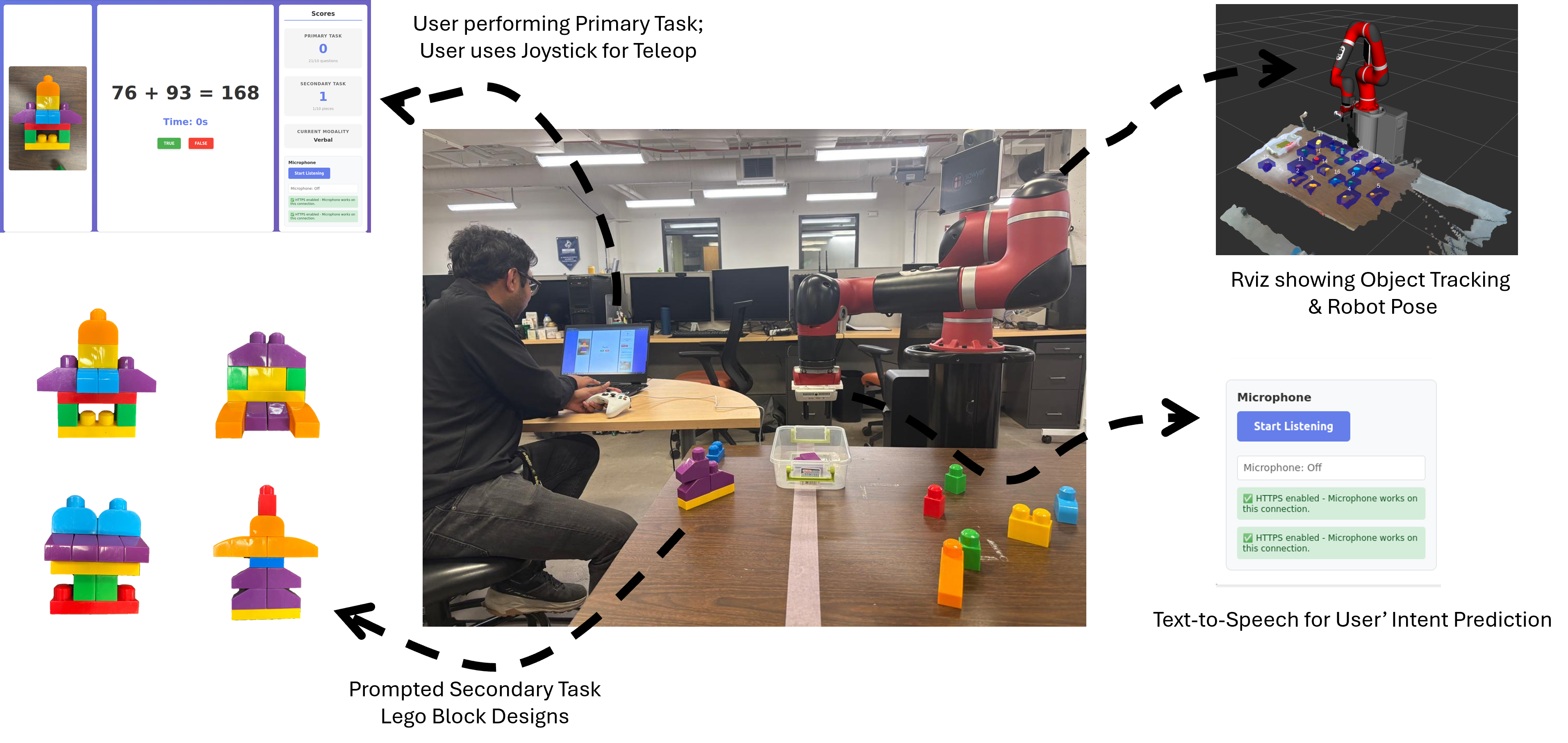 Dual-task interaction scenario combining teleoperation and verbal input. Concurrent modalities provide complementary evidence about intent formation, uncertainty, and cognitive load, informing when autonomy should assist, wait, or request clarification.